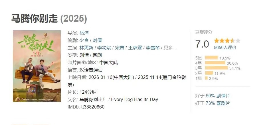不得不说,《马腾你别走》的立意真的很好,正因如此,这部电影的豆瓣评分为7分,对比于同期播出的电影,这个分数已经算非常高了。